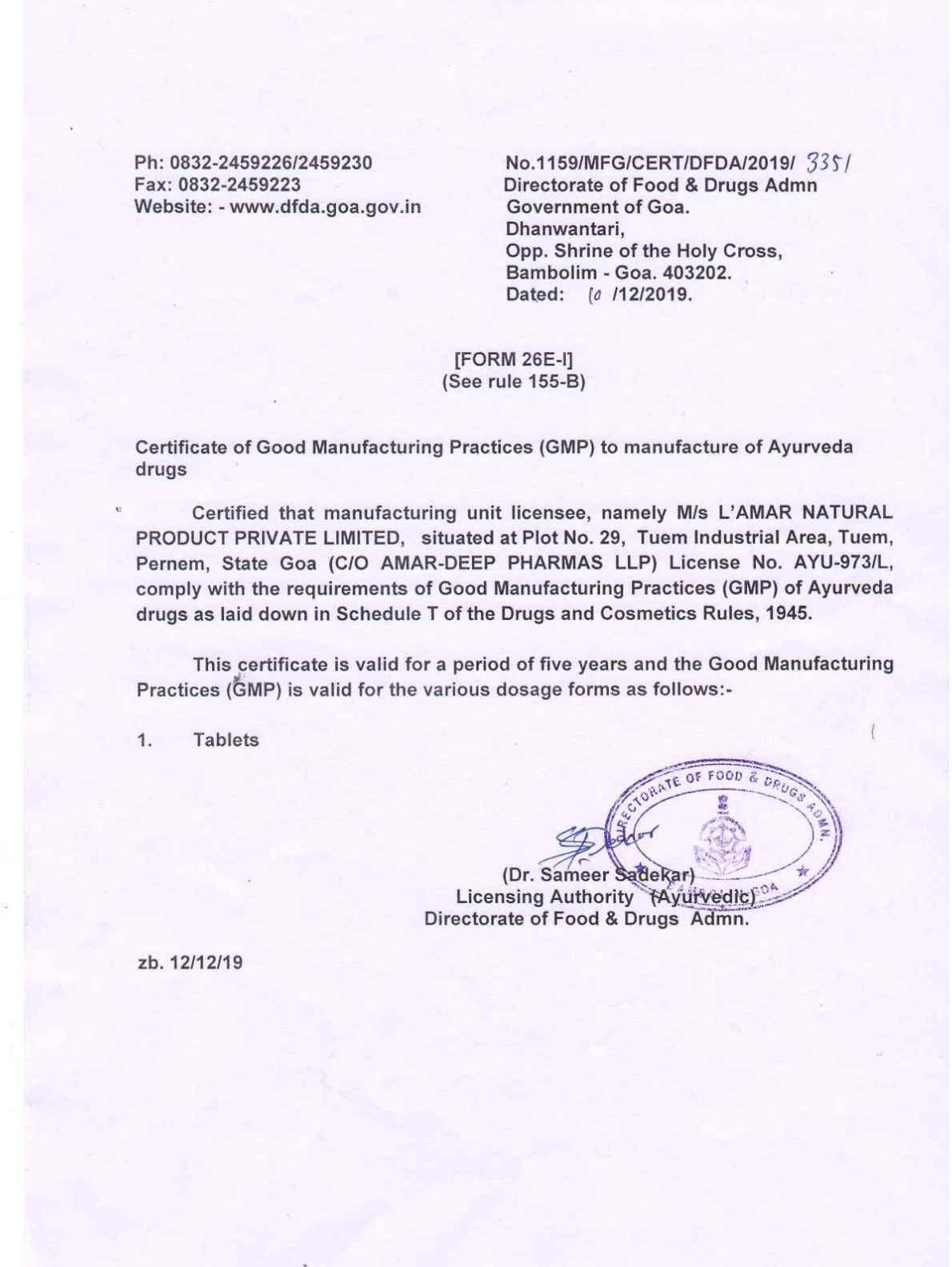 L'Amar Natural Product Private Limited has been awarded the Certificate of Good Manufacturing Practices (GMP) by the Directorate of Food & Drugs Administration, Government of Goa. This certification confirms that L'Amar complies with the GMP requirements for Ayurveda drugs as outlined in Schedule T of the Drugs and Cosmetics Rules, 1945. These certifications cover various dosage forms including liquids, capsules, tablets, granules, and ointments.