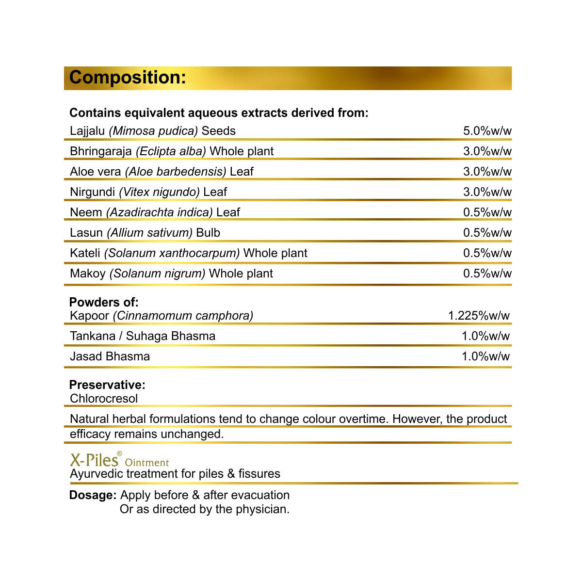 X-Piles ointment contains a blend of natural herbal ingredients, which may include Aloe vera,